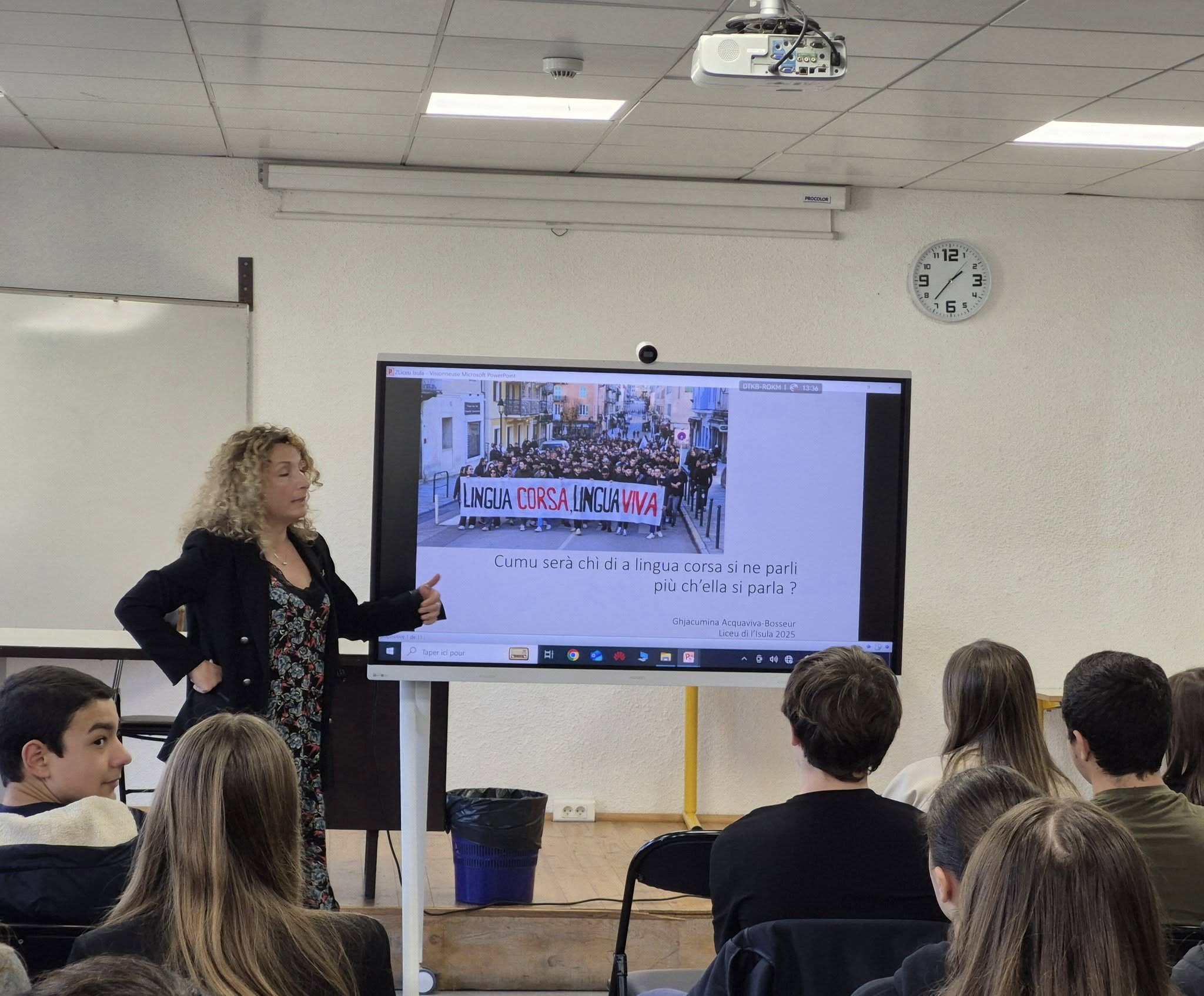 Cycle de conférences autour de la langue Corse : Initié par les représentants des élèves et soutenu par l ‘ établissement, les élèves bilingues de seconde du Lycée Polyvalent de Balagne ont assisté à une conférence donnée par Mme ACQUAVIVA-BOSSEUR, docteur en langue et culture corse, enseignante à l’Università di Corsica.