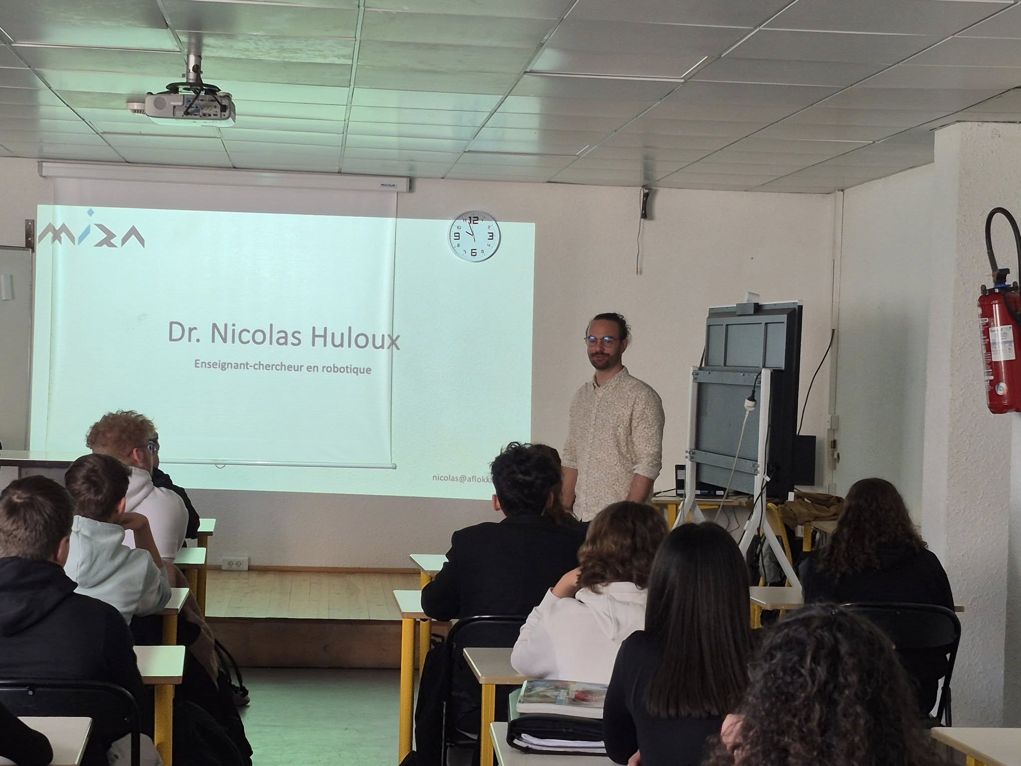 Les élèves de plusieurs classes du Lycée polyvalent de Balagne (terminale Maths complémentaires, 1ère spécialité Maths, 1B, 2A et 2D) ont eu l’opportunité de participer à une conférence avec M. Nicolas HULOUX, docteur en robotique et enseignant-chercheur à Ajaccio.