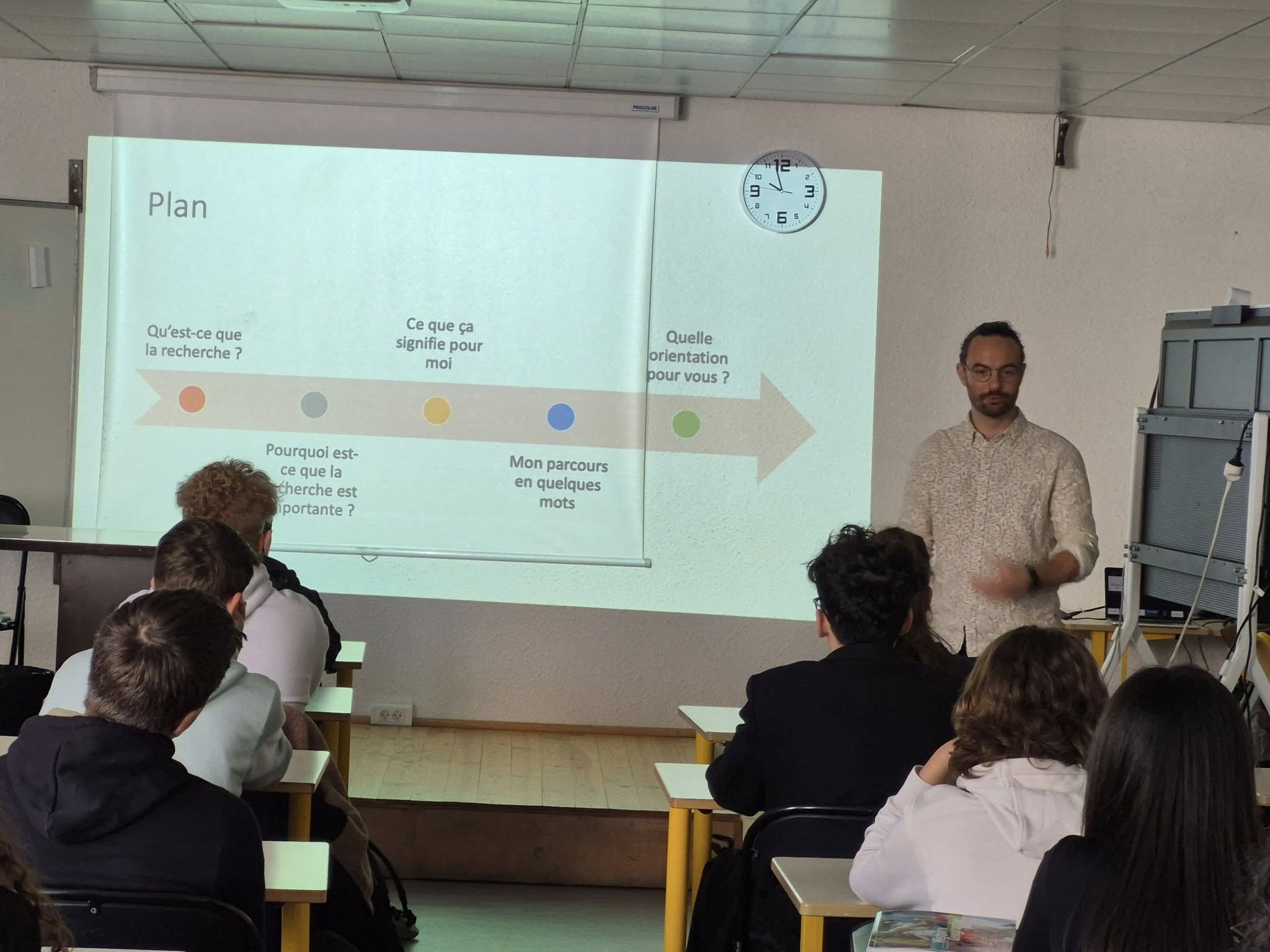 Elle avait pour objectifs de présenter aux élèves le parcours et les recherches de M.HULOUX, afin de stimuler leur curiosité scientifique, de les aider à envisager des carrières dans ce domaine et à les éclairer sur les métiers en vue de leurs choix d’orientation.